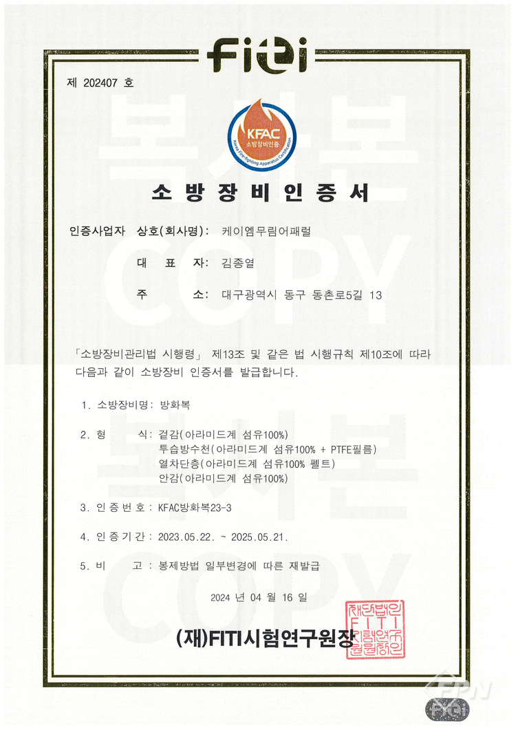 더욱이 방화복은 나라장터를 거쳐 공급해야 하기에 KFAC 인증을 획득하더라도 조달검사를 추가로 받아야 한다. 조달검사 중에 치수를 재는 관능검사 항목이 있는데 방화복을 정형화시키는 요인이 되고 있다.