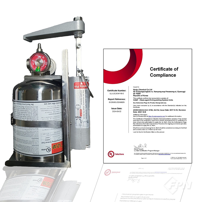 [FPN 최영 기자] = 국내에서 개발된 FK-5-1-12 자동소화장치가 미국 UL인증을 획득하고 글로벌 시장 개척에 나선다.