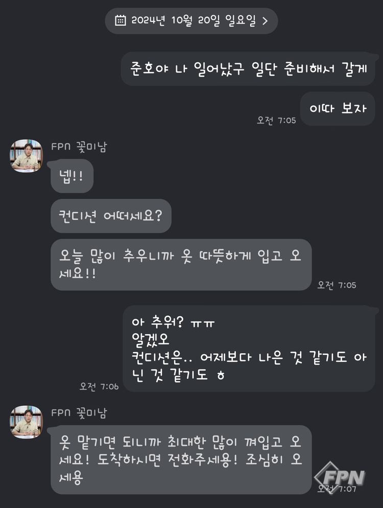 걱정하고 있을 박 기자에게 메시지를 보내자 꽤 추우니 따뜻하게 입고 오라고 언질을 줬다.