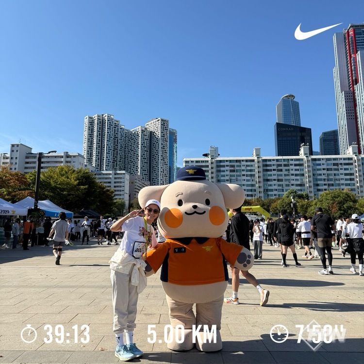 39분 13초에 결승전을 통과했다. 평균 페이스 7분 50초. 사람들에 휩쓸려 뛰다 보니 오버 페이스로 뛰었는데도 그런 느낌이 들지 않았다. 말 그대로 얼결에 뛴 기분이었다. 기념품 수령소로 가서 완주 메달을 받고 소방 캐릭터 ‘일구’와 인증샷도 찍었다.