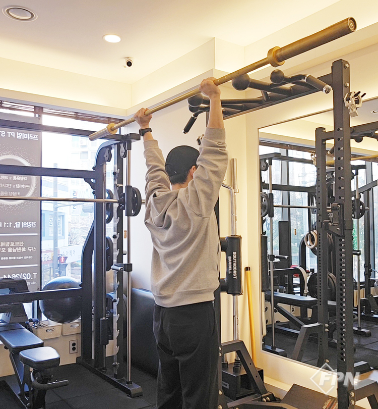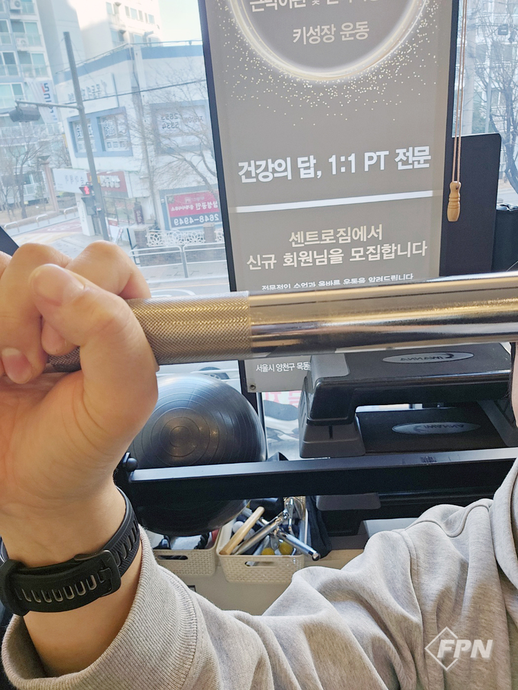 4. 그립 설정 후 빈 봉으로 뒷머리 중앙까지 올렸다 내리기를 반복합니다. 이때 반드시 양쪽 안전바 고리를 체크해야 합니다.