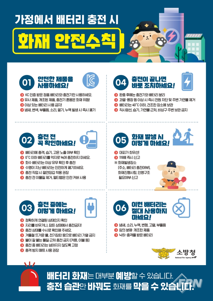소방서는 배터리 화재 예방 안전수칙으로 ▲KC 인증 정품 배터리와 충전기 사용 ▲충전 전 이상 여부 확인 (훼손ㆍ눌림ㆍ습기 침투 시 사용 금지) ▲충전 중 과열ㆍ변형 시 즉시 중단 ▲충전 완료 후 즉시 분리 및 환기된 곳 보관 ▲화재 발생 시 119에 즉시 신고 후 대피 ▲훼손ㆍ팽창ㆍ침수된 배터리 절대 사용 금지 등을 안내하고 있다.