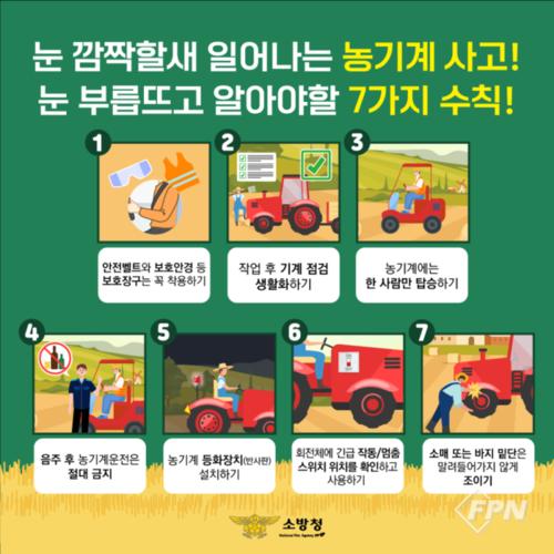 이에 소방서는 농기계 안전사고 예방을 위해 ▲작업 전ㆍ후 농기계 점검 철저 ▲음주 후 농기계 조작 금지 ▲도로 주행 시 안전 표지판 및 등화장치 부착 ▲회전체에 긴급 작동ㆍ멈춤 스위치 위치 숙지 ▲경사지나 위험지역에서는 저속 운전 ▲의복이 말려 들어가지 않도록 소매ㆍ바지 밑단 정리 등 안전수칙을 반드시 지켜야 한다고 안내하고 있다.