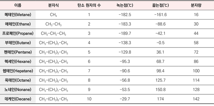 표를 보면 알겠지만 부테인의 끓는 점은 0℃ 부근이다. 따라서 부테인까진 상온에서 기체이고 펜테인부터는 액체로 존재한다는 걸 추측할 수 있다. 휘발유와 등유, 경유(탄소 개수가 대부분 여섯 개 이상)는 액체라는 것도 알 수 있다.