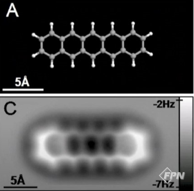원자를 볼 수 있으니 당연히 더 큰 분자를 보는 건 식은 죽 먹기다. IBM의 또 다른 그림에서는 다섯 개의 링 구조로 된 펜타센이라는 물질을 원자힘 현미경으로 관찰했다. 우리가 교과서에서 본 탄소 여섯 개의 링으로 된 탄화수소도 우리가 생각한 그 모양을 갖고 있음을 알 수 있다.