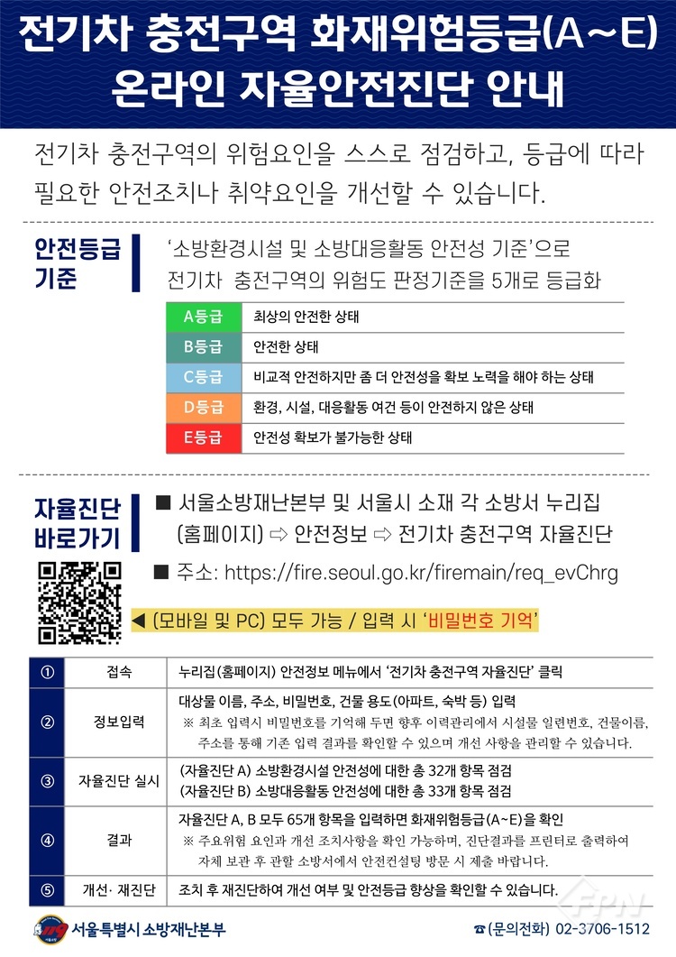 자율진단 주체는 지하에 충전구역이 설치된 대상물의 관계인과 관리자다. 자율진단 결과(안전등급 A~E급)에 따른 화재안전컨설팅을 받을 수 있다.