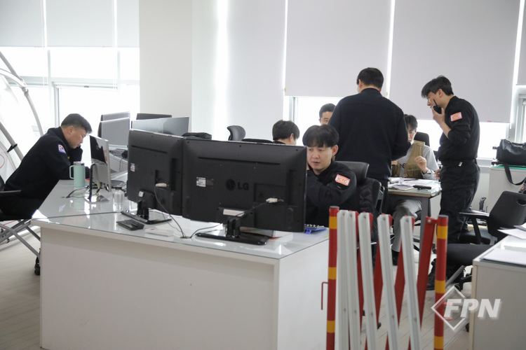 ![]() ▲ 훈련 통제실에서 관계자들이 모니터를 통해 가상 재난 훈련 진행 상황을 주시하고 있다. |