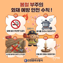 [FPN 정재우 기자] = 인천중부소방서(서장 김현)는 봄철 부주의로 인한 화재 피해를 줄이기 위해 시민들에게 화재예방 안전수칙 준수를 당부한다고 13일 밝혔다.
