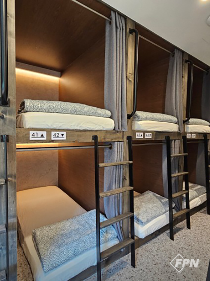 각 취침실에는 한 사람이 겨우 누울 수 있는 2층 침상 최소 20여 개가 빈틈없이 놓여 있다. 일부 객실은 수십 개의 2층 침상을 좌우 두 개의 세트로 배치했다. 침대마다 사생활 보호를 위한 커튼이 설치됐고 휴대전화 충전을 위한 콘센트도 갖추고 있었다. 소방시설로는 자동화재탐지설비, 옥내소화전, 완강기, 간이완강기 등이 구비됐다. 3층은 2024년 5월 3일, 6층은 2024년 12월 20일 숙박시설로 용도변경 허가를 받았다.