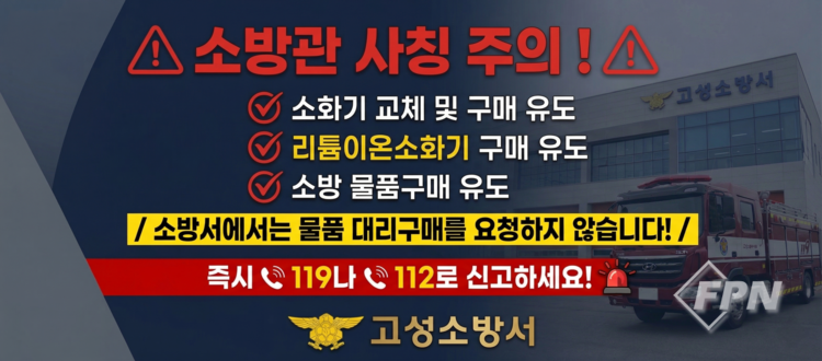 [FPN 정재우 기자] = 경남고성소방서(서장 전수진)는 최근 고성군 일대에서 소방공무원을 사칭해 소방 물품 구매를 유도하는 사례가 잇따르고 있어 각별한 주의를 당부한다고 13일 밝혔다.