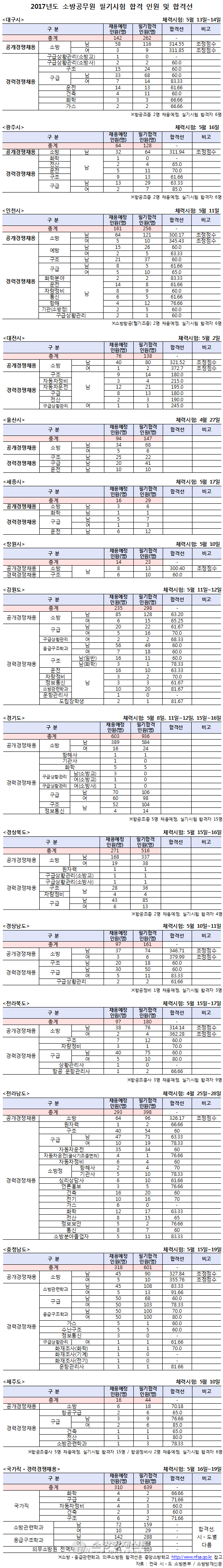 이하는 본지(FPN/소방방재신문)에서 취합한 ‘2017년도 각 시ㆍ도별 소방공무원 필기시험 합격 인원 및 합격선’ 현황이다.