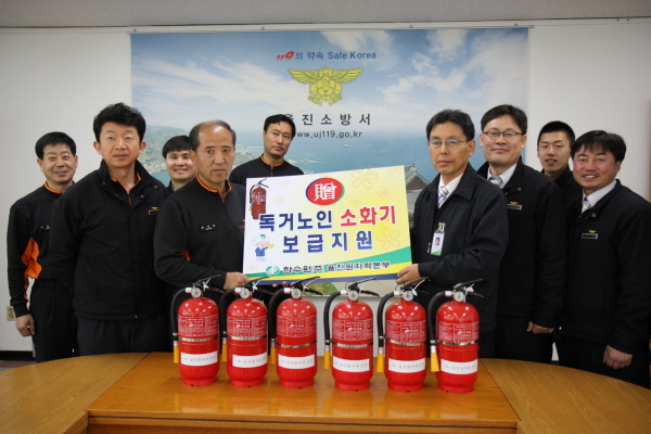 지난 25일 (주)한수원 울진원자력본부는 울진소방서를 방문해 분말소화기 150개를 기증하고 전달식 행사를 가졌다. 기증된 소화기들은 관내 독거노인세대 및 오지마을 소화기 보급 사업에 사용될 예정이다. 김중하 객원기자 flight1011@korea.kr