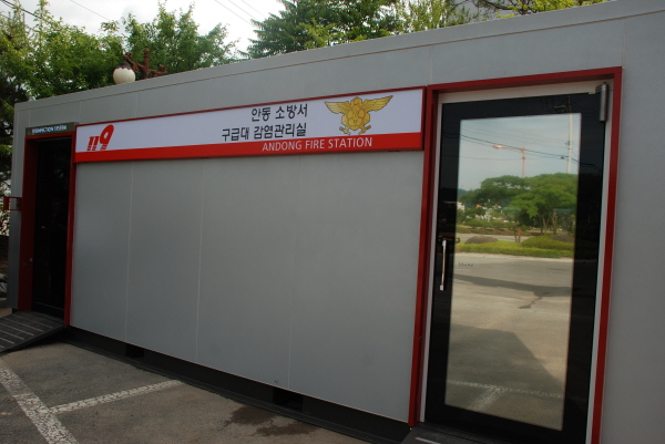 안동소방서(서장 백남명)는 병원 전 단계 응급의료체계의 중추적인 역할을 수행하는 119구급차의 체계적인 감염관리를 위하여 지난 14일 본서 전정에 119구급대 감염관리실을 설치 운용했다.