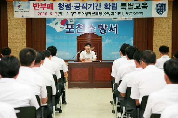 포천소방서(서장 신종훈)는 지난 7일 오전 3층 대회의실에서 소방공무원 100여명이 참석한 가운데 정부정책의 최우선 화두인 소방분야 친서민정책 및 공정한 사회를 만들기 위한 소방공무원의 역할변화를 주제로 청렴 및 친절교육 시간을 가졌다.