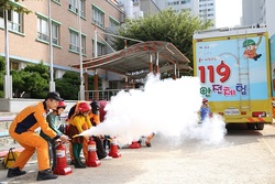 ▲ 북정초등학교에서 어린이들이 소화기 사용하기를 체험하고 있다. © 이선구 객원기자