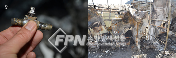 3월 초순경임을 고려할 때 당시 비닐하우스에서는 쌀쌀한 날씨 탓에 보일러를 가동했을 터다. 그러나 보일러실[사진 4]에는 연통이나 보일러 버너 부분에 출화흔적은 없고 오히려 외부에서 수열 받은 흔적으로 잔류돼 있었다. 주변 플라스틱도 살짝 용융된 형태로 잔류된 채 탄화되지는 않았다. 보일러실 벽면에 변색흔적은 보일러실 외부에서 수열에 의한 것으로 식별된다.