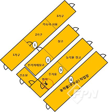사망자는 주거용 비닐하우스 출입구 부분에 앙와위 자세로 발견됐다. 아마도 화염으로부터 피난하려고 했던 것 같다. 비닐하우스 구조는 출입구가 3중으로 돼 있고 주거용은 비닐하우스 내부에 샌드위치패널로 주택을 축조해 사용했다([그림 1] 중 ③번 참조).