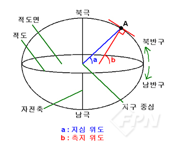 위도에는 [그림 1]의 지심 위도(Geocentric Latitude)와 측지 위도(Geodetic Latitude)를 포함해 다양한 위도가 있다. 타원체면의 특정 지점(A)에서 지구 타원체 중심으로 그은 직선이 적도면과 이루는 각(a)을 그 지점의 지심 위도라 한다. 특정 지점(A)에서 타원체면의 수직 방향으로 그은 직선이 적도면과 이루는 각(b)을 그 지점의 측지 위도라 한다.
