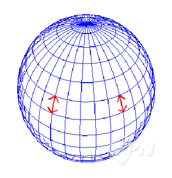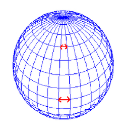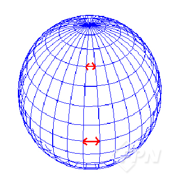 [그림 4]와 같이 일정 각도 간격의 경도선들은 적도 부근에서 거리 간격이 가장 넓고 극 지역으로 갈수록 좁아져 남극과 북극에서 모두 모이게 된다.
