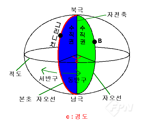 [그림 3]과 같이 지구 자전축을 한 변으로 하고 나머지 변은 타원체면과 접해 반원 모양이 되는 평면을 수직권이라고 한다. 수직권에서 타원체면에 접하는 변을 경도선(Meridian) 또는 경선, 자오선(子午線)이라 한다. 특히 영국의 그리니치 천문대(Greenwich Royal Observatory)를 지나는 자오선을 본초 자오선(Prime Meridian)이라고 한다.