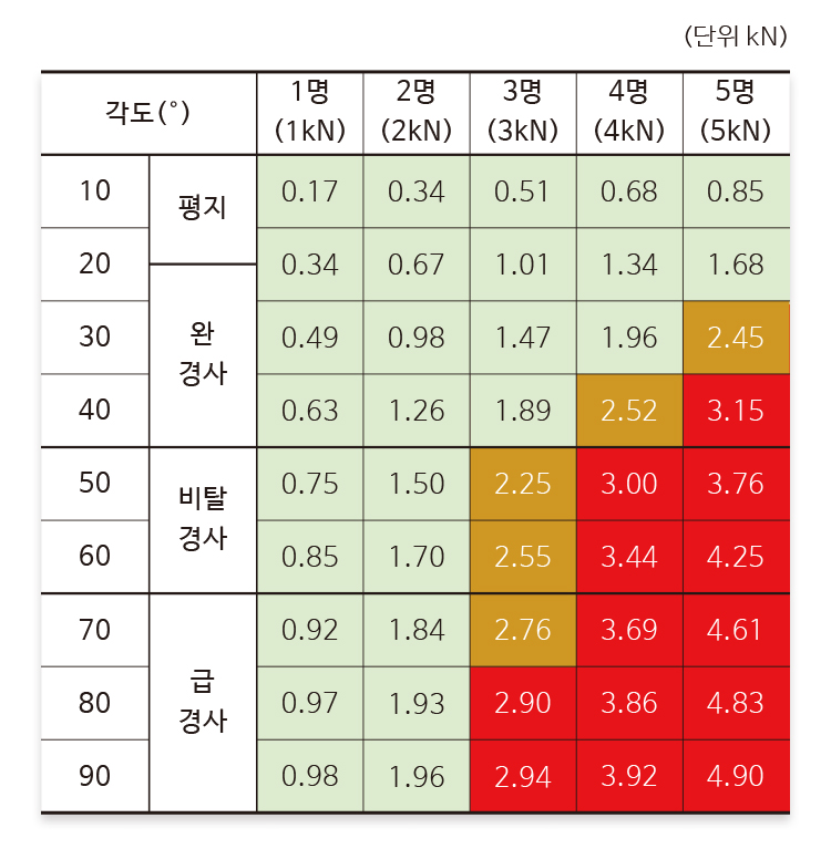 위 예시 조건에서 11㎜ 로프를 사용할 때 로프의 실질 강도는 21kN이 되므로 각도에 따른 로프에 걸리는 하중×10배 안전계수를 적용할 경우 2.1kN까지가( ■ ) 로프 구조 작업의 안전계수 허용범위가 된다. 12.5㎜ 로프는 실질 강도가 28kN으로 2.8kN까지( ■ ■ ) 안전계수 허용범위가 된다. 붉은색 범위는 안전계수의 범위를 넘어가므로 안전을 고려해 각도에 따른 구조방법을 변경해야 한다. 경사면에 따라 로프에 걸리는 하중은 각 구성 장비의 강도에 따라 안전계수에 영향을 준다.