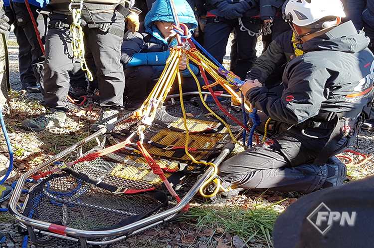 5. 수직 자세 수직의 좁은 크랙이나 밀폐된 공간, 높은 방향 지점이 없는 가장자리 등에서 요구조자를 태우고 내리기ㆍ올리기 작업을 위해 사용한다. 들것 긴 난간은 메인 라인과 평행하도록 한다. 브리들은 필요에 따라 머리, 혹은 몸통 위치의 들것 옆구리 뼈대(강한 지점)에 연결한다. 구조대원은 필요할 경우 연장된 매듭 꼬리에 위치하고 들것에 다리를 벌리고 있거나 수직면에 발을 대지 않고 의지해 매달린다.