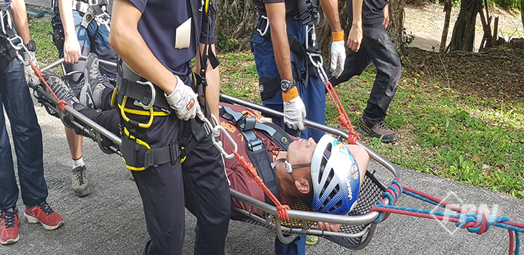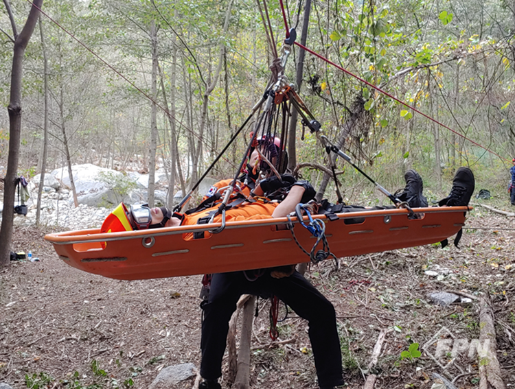 2. 누운 자세 가장자리나 완만한 턱에서는 표준 자세에서 중간 자세로 변경하지 않고 표준 자세에서 들것 바닥 면과 수평이 되게 누운 자세를 만든다. 이후 들것을 가슴 쪽으로 당겨 구조대원 다리가 움직일 수 있는 공간을 확보해 들것을 제어하면 중간 자세의 변환 없이 신속하게 가장자리나 완만한 턱을 넘어갈 수 있다. 이 경우에는 들것을 천천히 움직여야 한다.