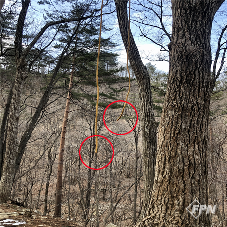 스토퍼 매듭을 만드는 위치와 방법은 간단하다. 로프 끝에서 1.5~2m 떨어져 매듭을 묶으면 된다. 실제로 하강하다 스토퍼 매듭을 만나면 [사진 3, 4]처럼 작업자는 나무에 발을 고정할 수 있다. 나무를 발로 밀어 반동을 이용해 원하는 위치에서 하강할 수 있다.