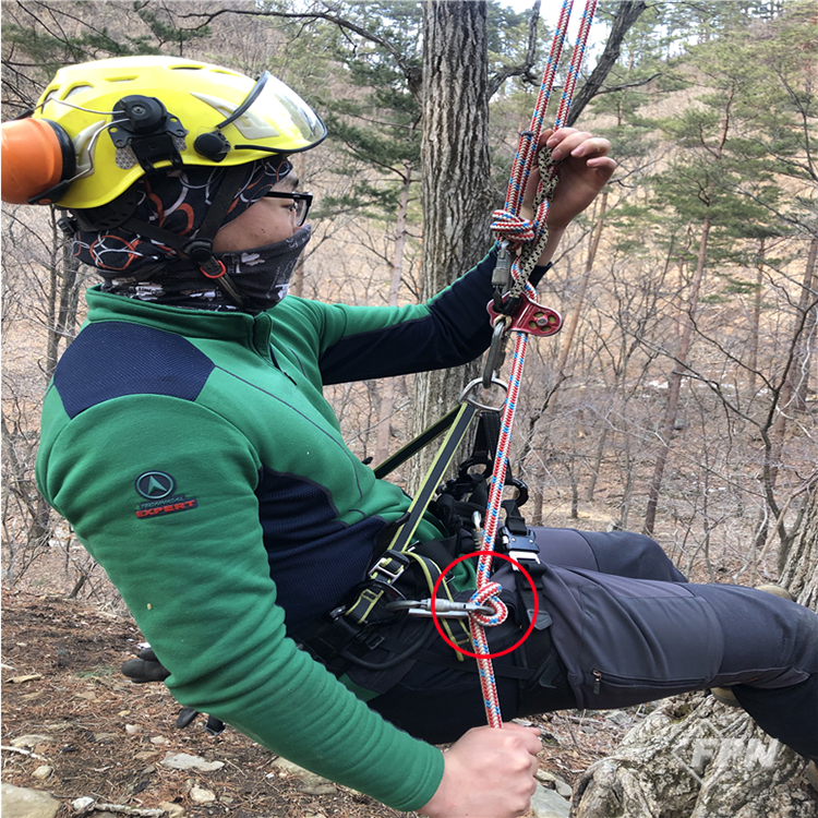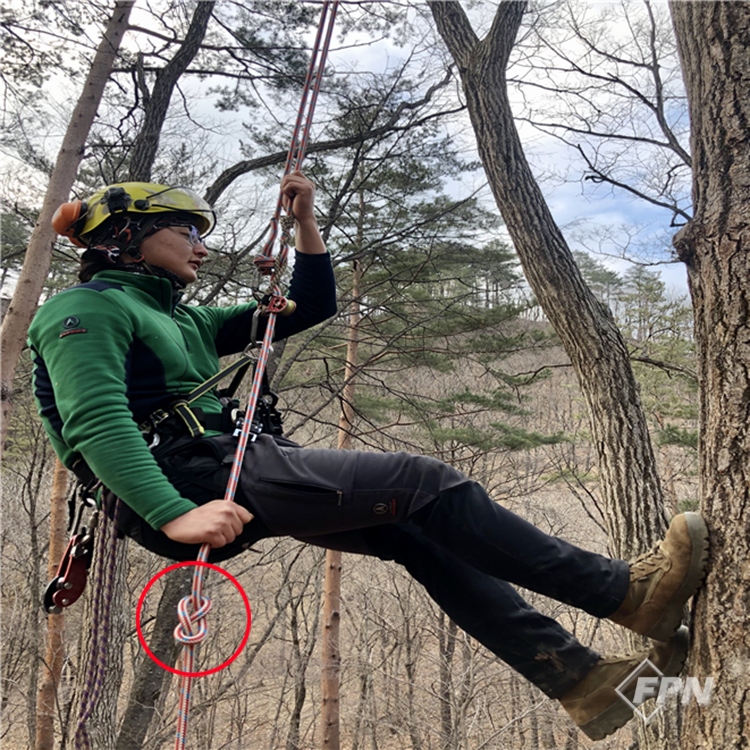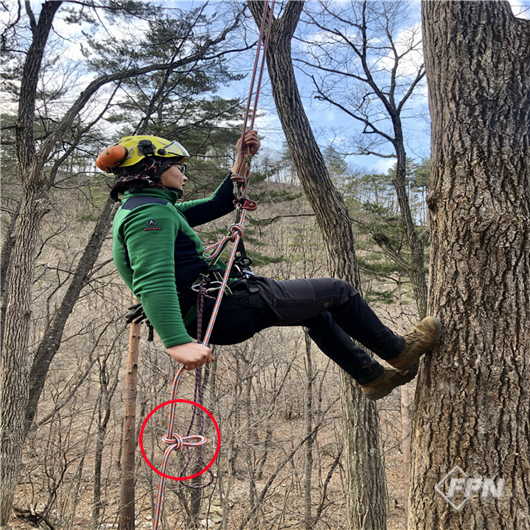 모든 수목 관리와 고소작업은 단독으로 진행해선 안 된다. 그렇기에 올라가는 작업자가 깜빡하고 등반했다면 지상에서 보조 작업을 해주는 사람이 본인 키 높이에서 팔을 올려 스토퍼 매듭을 만들어줘야 한다.