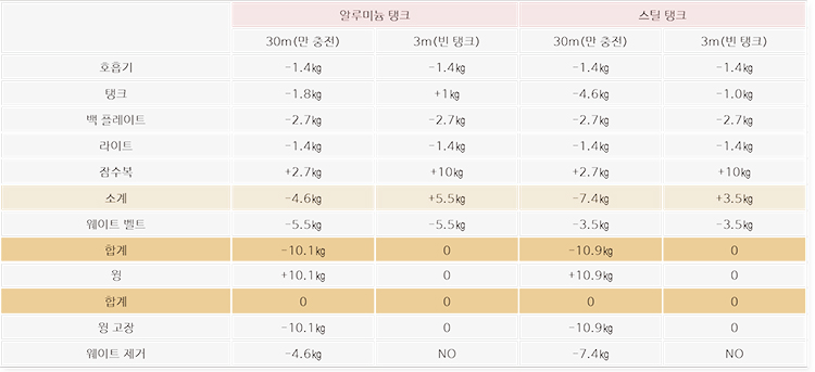 따라서 알루미늄 탱크로 다이빙할 경우 수심 3m에서 빈 탱크가 되면 5.5㎏의 양성 부력이 생기므로 이에 맞게 5.5㎏ 웨이트를 착용해야 한다. 또 수심 30m에서는 –10.1㎏만큼 음성 부력이 생기므로 부력조절기는 그에 상응하는 용량의 사이즈를 착용해야 한다. 현재 우리는 40lb용 부력조절기를 가장 많이 사용하는데 ㎏으로 환산하면 약 18㎏이 되기 때문에 용량이 충분하다고 볼 수 있다.