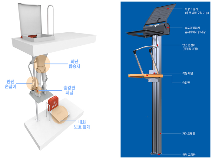 승강식 피난기는 건축물에 화재 등 위급상황 발생 시 사람들이 안전한 장소로 탈출할 수 있도록 설치하는 피난기구 중 하나다. 무동력으로 작동돼 화재로 인한 정전 시에도 사용할 수 있다.