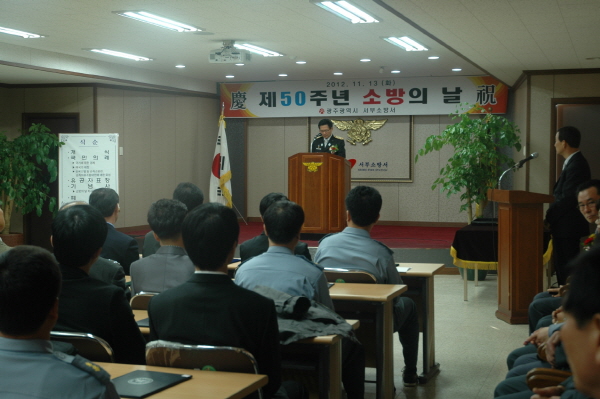 | ▲ 소방의날 축사를 낭독하는 이성연 서장 © 강혜원 객원기자 | | 광주 서부소방서(서장 이성연)는 제50주년 소방의 날을 맞아 지난 13일 서부소방서 3층 회의실에서 소방공무원, 의용소방대원 등 백여명이 참석한 가운데 기념식을 가졌다. 이날 기념식에는 공무원 연금공단 광주전남 김방영 지부장이 내빈으로 참석하여 소방의 날을 축하했다. 서부소방서는 이날 서울 올림필공원에서 열리는 중앙기념식 행사에서 국무총리 기관표창을 받았다. 이성연 서장은 ‘시민의 행복이 곧 우리의 행복인 만큼 겨울철 화재예방과 안전문화 확산에 총력을 다할 것’ 을 다짐했다.