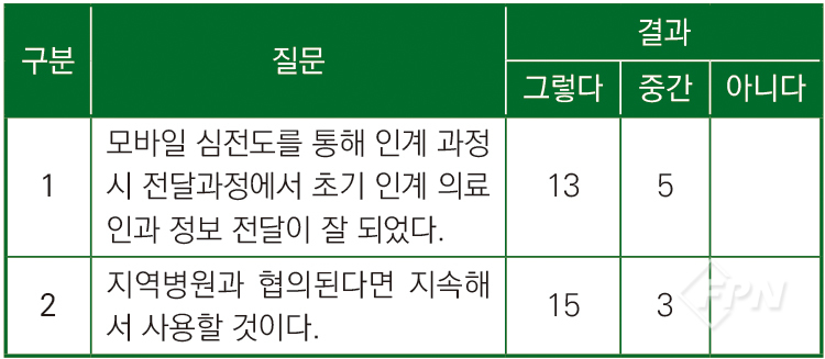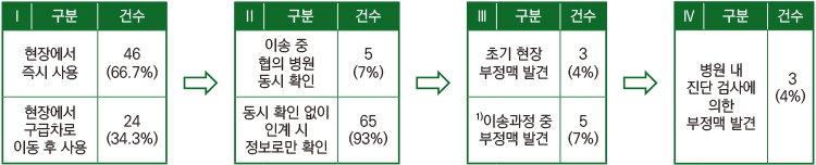 Ⅲ단계와 Ⅳ단계에서는 모바일 심전도를 통한 초기 구급 현장에서 부정맥 발견, 이송 중 발견에 대한 현장 활용도를 확인했다.