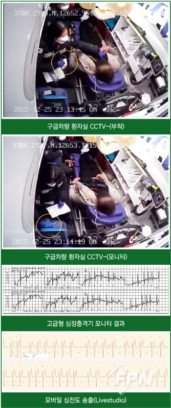 1) 자동식 심장충격기 모니터와 병행 사용 부정맥 발견 건수 2) 현장 미사용으로 환자접촉 후 구급차 이동, 이송 중 적용시간