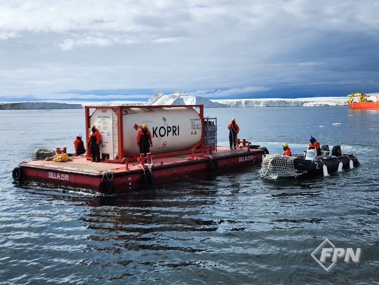 하지만 앞서 말했듯이 기지 앞바다의 얼음이 다 깨져 버린 상황이었다. 어쩔 수 없이 해상에서 바지선을 띄운 후 조디악 보트를 이용해 바지선을 끌어 기지 부두 앞으로 이동했다. 크레인을 이용해 컨테이너를 육상으로 옮기면서 작업했다.