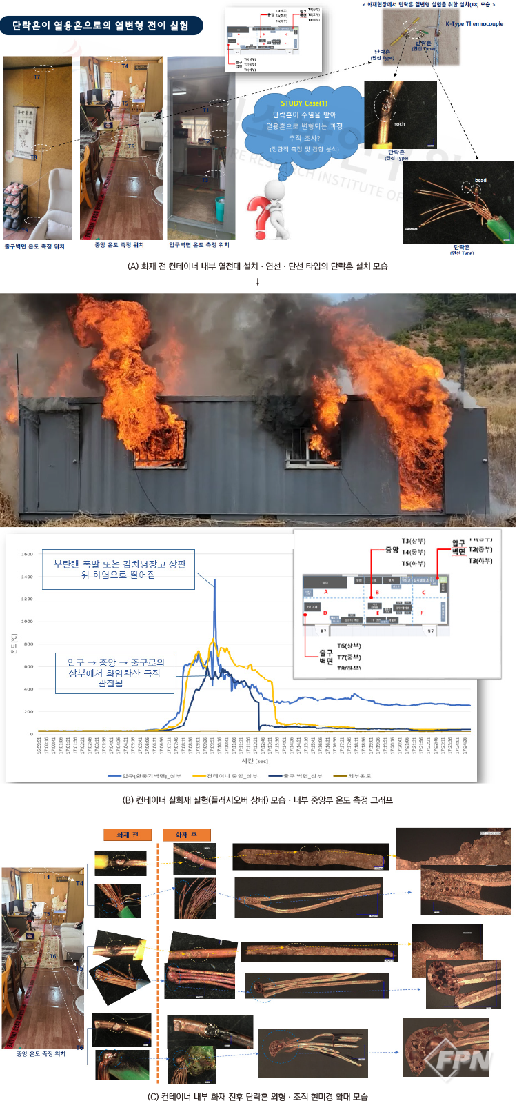 다른 실험과 병행해 최근 3년간 컨테이너 실화재 실험 시 이러한 변수조건을 찾기 위해 동일한 지점에 실시간 온도변화를 측정하는 열전대 온도 포인트를 찾으려고 노력했다. [그림 4]의 (A)와 같이 컨테이너 내부 3포인트를 천정부, 중간 높이, 바닥부로 한 후 생성한 단락흔을 부착해 온도변화를 측정했다.