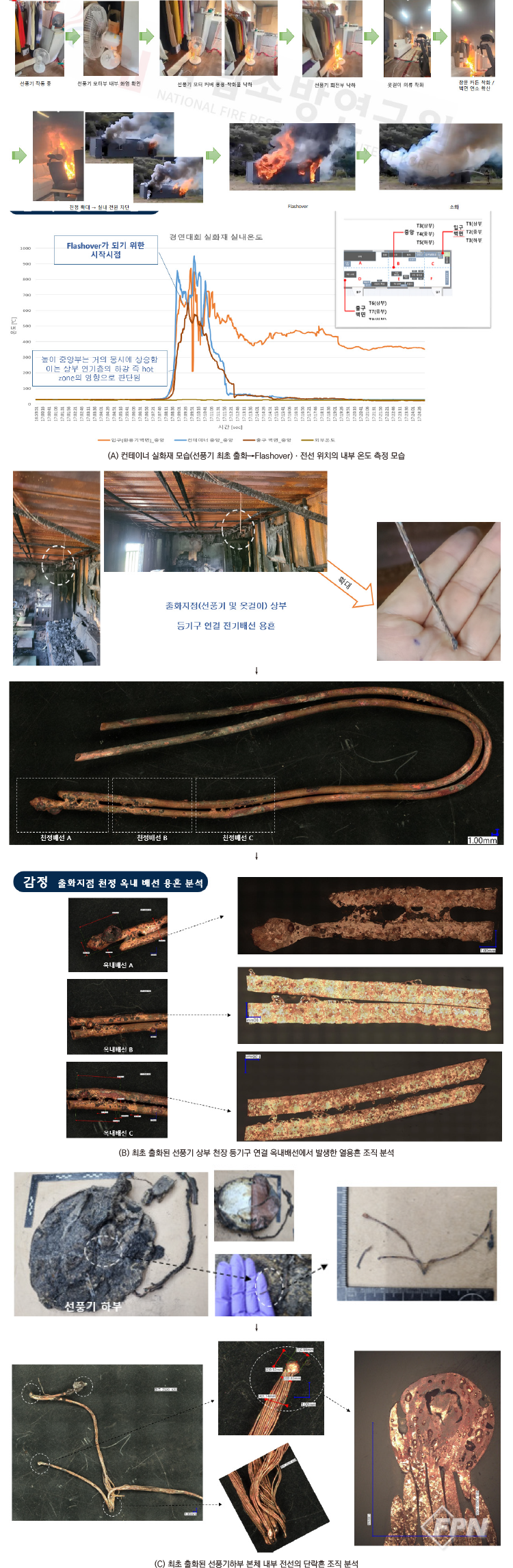 [그림 3]의 (C)는 최초 출화된 선풍기 전원 스위치 부분의 내부 전선 용흔이 단락흔으로 분석됐다. 즉 해당 용흔의 모양과 조직, 분석기법 등이 중요한게 아니라 열용흔이 환경에 노출됐는지가 먼저 분석돼야 하지 않을까.