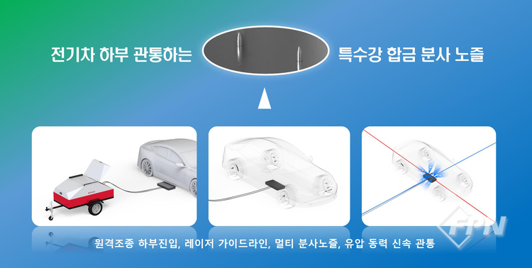 이 장비의 특징은 불이 난 전기차에 소방관이 직접 접근하지 않고도 화재를 진압할 수 있다는 점입니다. 원거리에서 조종장치를 이용해 관통부를 배터리가 장착된 전기차 하부로 이동시킨 후 구멍을 내고 소화약제를 배터리에 직접 분사하는 방식입니다.