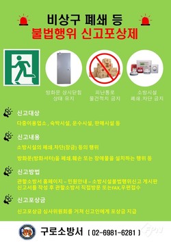 [FPN 정재우 기자] = 구로소방서(서장 윤영재)는 ‘소방시설 등 불법행위 신고포상제’ 운영 내용을 집중 홍보한다고 20일 밝혔다.