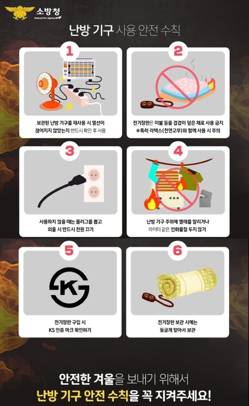 전기 난방기구 화재 예방을 위한 안전수칙은 ▲습기와 먼지 제거 후 사용 ▲제품과 벽면 사이의 간격 10㎝ 이상 이격 ▲전원선이 눌리지 않게 주의 ▲낡거나 손상된 전선 주기적 교체 ▲전기용품 규격에 맞는 퓨즈와 차단기 사용 ▲문어발식 콘센트 사용 금지 ▲과전류로 인한 고열 발생 방지 등이 있다.