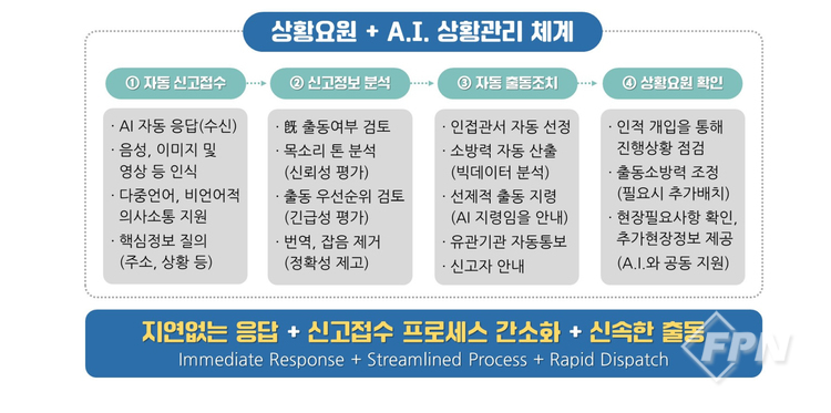 위원회는 이 같은 문제를 타파하기 위해 ‘AI 공동대응 차세대 종합상황실’ 구축이 필요하다는 입장이다. 이는 119종합상황실의 신고 대응 전 과정에 AI 기술을 접목해 동시다발적 신고에 따른 부하를 분산하고 대응의 정확ㆍ효율성을 높이는 체계다.