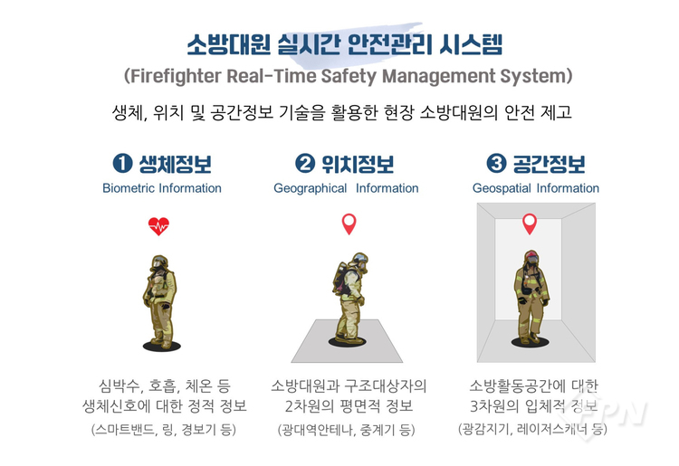 위원회에 따르면 이 시스템은 ‘생체정보’와 ‘위치정보’, ‘공간정보’ 등 크게 세 가지 유형으로 구분된다. 여기서 ‘생체정보’는 현장 소방대원의 심장 박동, 호흡 등을 측정하는 정적 정보, ‘위치정보’는 평면상에 현장 소방대원의 위치를 표시하는 2차원 정보다. ‘공간정보’는 3차원 입체 공간에 대한 정보다.