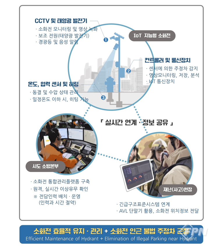 즉 상시 유지ㆍ관리체계를 갖춰야 하는 소화전의 수압이나 결빙 상태 등을 소방공무원이 일일이 방문해 점검할 필요 없이 부착된 센서와 통신장치를 통해 원격으로 실시간 모니터링ㆍ점검하는 통합관리를 실현한다.