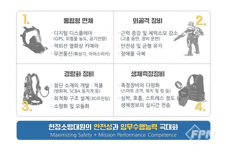 위원회는 ‘기능 집약화’와 ‘신체능력 보완’, ‘경량화’, ‘실시간 연계’ 등 크게 네 가지 부분에서 개인보호장비의 발전이 이뤄질 거로 봤다.