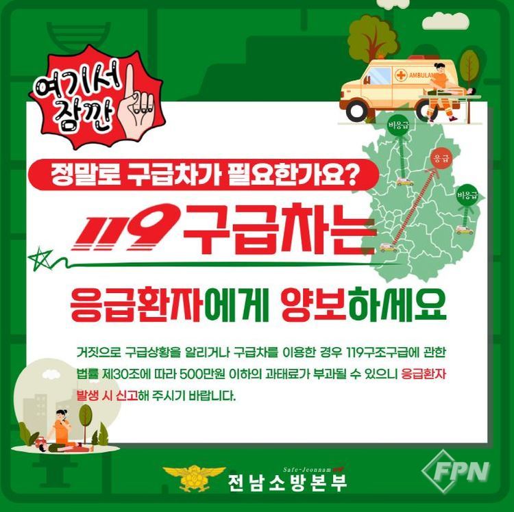 [FPN 정재우 기자] = 영광소방서(서장 박의승)는 올바른 119구급차 이용문화 정착에 대해 홍보 중이라고 25일 밝혔다.