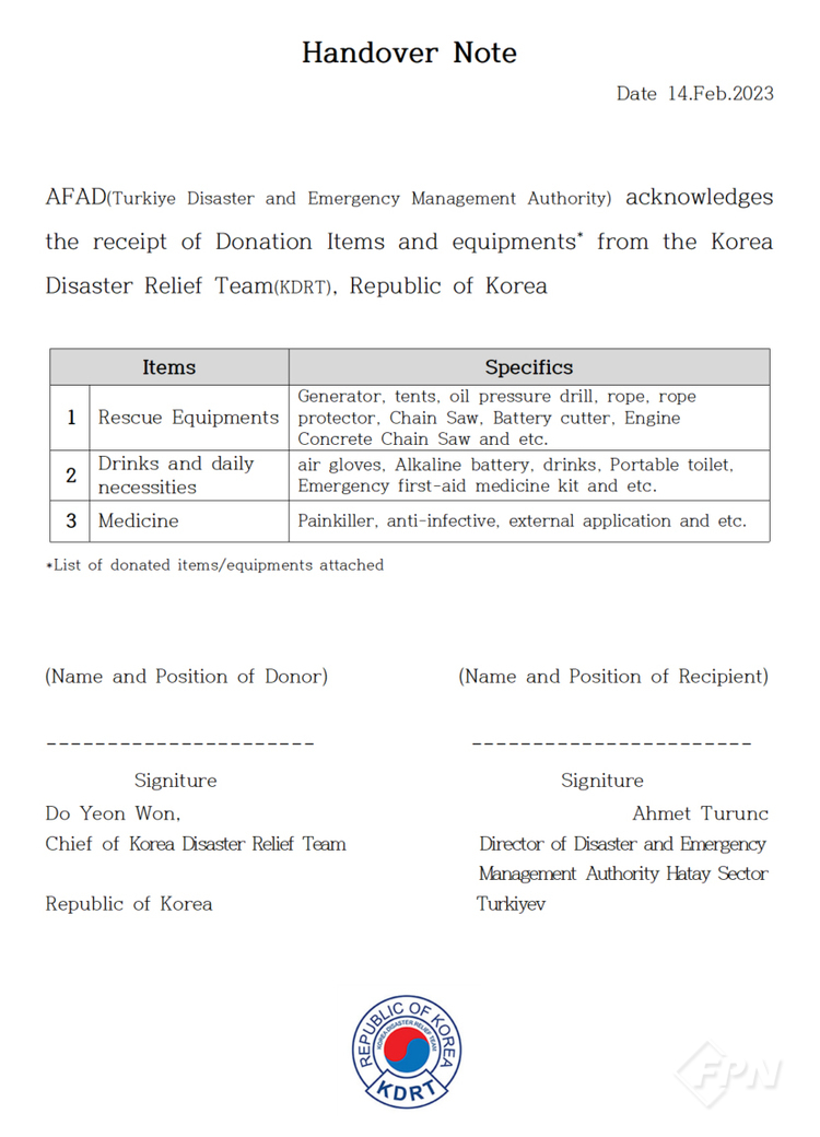 구조장비와 의약품을 기증하면서 대한민국 해외긴급구호대의 장비로 우리가 구하지 못한 더 많은 생명을 구할 수 있길 간절히 기원했다.