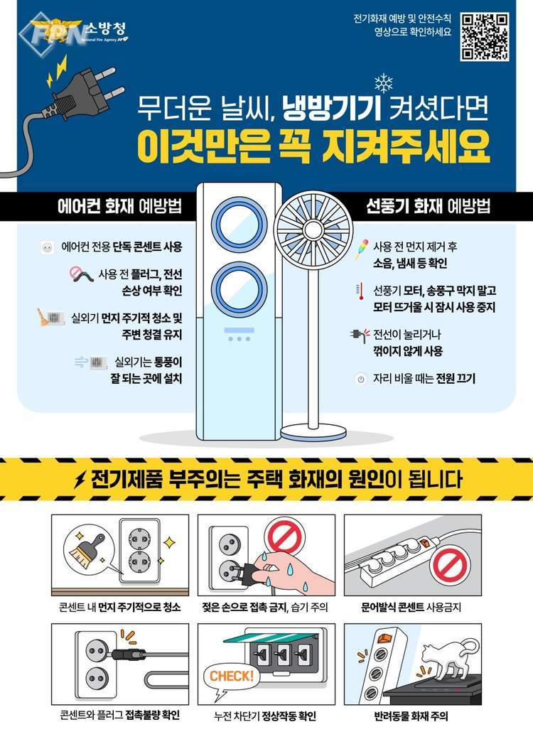소방서에 따르면 최근 이어지는 집중호우와 무더위로 습도가 높아져 에어컨 사용량이 급증하고 있다. 이에 따라 소비전력이 큰 전자기기를 멀티탭에 동시에 연결할 때 과열로 인해 화재가 발생할 수 있으며 고용량 전자제품은 반드시 개별 콘센트를 사용하는 게 안전하다.