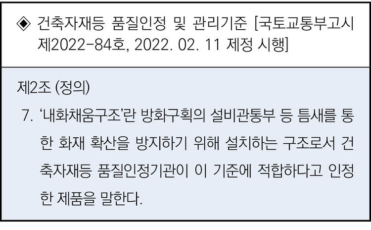이런 내화채움성능이 인정된 구조의 경우 연기와 불꽃, 열을 차단할 수 있는 성능이 표시된 내화채움구조 시험성적서 사본을 반드시 확인해야 한다.