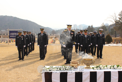 | ▲ 故 윤영수 소방장 순직 1주기 추모식 엄수 © 포천소방서 | | 포천소방서(서장 서삼기)는 지난 13일 국립대전현충원에서 지난해 포천시 가산면 소재 공장화재 현장에서 순직한 고(故) 윤영수 소방장의 순직 1주기를 맞아 고인의 숭고한 희생정신과 넋을 기리고자 국립대전현충원 묘역에서 추모행사를 가졌다고 14일 밝혔다. 이날 추모행사에는 유가족과 서삼기 서장을 포함해 동료, 선·후배 소방공무원 등 총 35명이 참석했으며 고인에 대한 헌화와 분향 순으로 진행됐다. 추모행사에 참석한 동료 소방대원들은 재난현장에서 몸을 사리지 않고 소방관의 사명감을 몸소 보여준 고인들의 희생정신을 되새기고 새로운 각오와 자세로 국민의 안전을 위해 책임을 다할 것을 다짐했다. 서삼기 서장은 “1년 전 고인들이 순직한 그 날의 아픈 기억들은 절대 잊지 말고 다시는 순직사고가 발생하지 않도록 최선을 다하며 숭고한 희생정신을 이어받아 안전 파수꾼으로 거듭나자”고 말했다. 김충기 객원기자 kck8714@naver.com