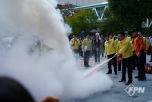 훈련에는 김민석 국무총리도 참여해 옥외소화전에서 소방호스를 연결해 화재진압 체험, 완강기 사용법 교육, 심폐소생술 실습에동참했다.
